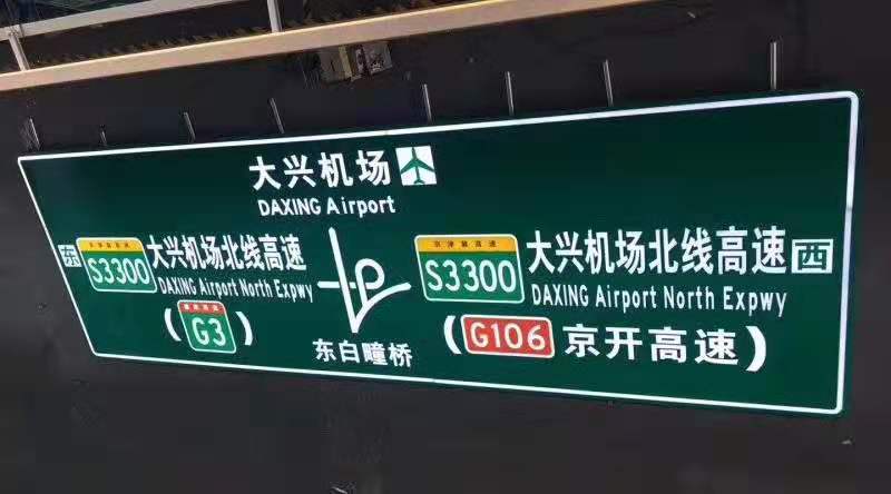 北京大興國際場(chǎng)外圍道路已重新規(guī)劃布局,相應(yīng)道路拖延延伸,路徑指引標(biāo)志系統(tǒng)采用最先進(jìn)的LED主動(dòng)發(fā)光交通標(biāo)志,標(biāo)志實(shí)現(xiàn)時(shí)空同步,同一塊標(biāo)志中既顯示到達(dá)大興機(jī)場(chǎng)距離,又讀取高德通行數(shù)據(jù),測(cè)算出平均車速,給出達(dá)到大興機(jī)場(chǎng)的時(shí)間,方便駕駛?cè)藛T有效規(guī)劃路徑、全天候視認(rèn)標(biāo)志版面,目前已全部完工、交付。