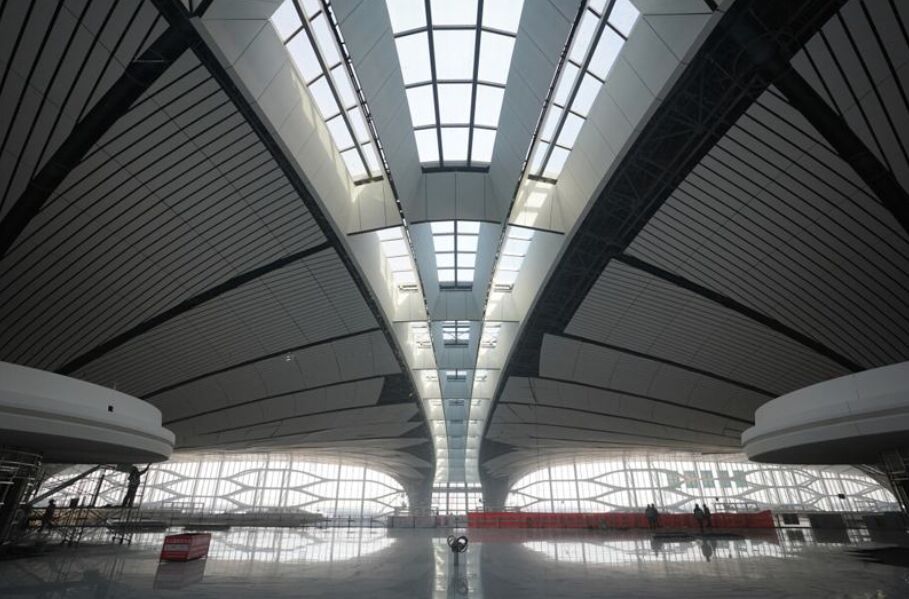 俯瞰北京大興國際機(jī)場(chǎng),就像一只展翅欲飛的鳳凰,咖啡黃的外體,頭尾對(duì)稱,四翅展開,一副雄越宇宙的姿態(tài),主要主要由航站區(qū)、飛行區(qū)、綜合交通中心等部分組成。屋頂采用了鋼網(wǎng)架結(jié)構(gòu),由63450根桿件和12300個(gè)球節(jié)點(diǎn)拼裝而成,從空中看,形成了一個(gè)不規(guī)則的自由曲面空間。