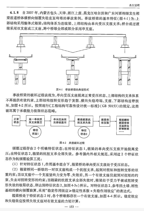 據專業標準了解,該處橋梁上部結構采用整體式箱梁;結構體系為連續梁,上部結構由單向受壓支座體系;橋臺或過渡墩采用雙支座或三支座,跨中橋墩全部或部分采用單支座。該類型橋梁易被破壞的表現為:單向受壓支座脫離正常受壓狀態,上部結構的支承體系不再提供有效約束,上部結構扭轉變形趨于發散、橫向失穩垮塌,支座、下部結構連帶損壞。參見行標《公路鋼筋混凝土及預應力 混凝土橋涵設計規范》(JTG 3362-2018)。