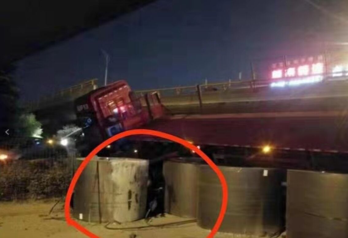 據了解,事故發生時,通過的貨車嚴重超載,承載了6套熱軋卷板,每套重量約28535kg,算一算,貨品總重:28.535噸/卷*6卷=171.210噸。再加上貨車自重,整體重量約190噸。該貨車通行時,行駛路徑為側邊行走,然后高架橋面側翻了。