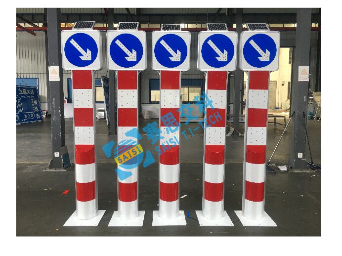 發光警示柱,主體材質為鍍鋅鋼管(直徑89mm和140mm),外表面黏貼紅白相間,或黃黑相間反光膜,頂部配置發光柱帽(內置太陽能板和鋰電池),在夜晚時,柱帽能自動感應閃爍發光,起到動態警示的效果,且相鄰安裝的發光警示柱具備同步功能,能保持同步閃爍的節奏,安裝在一起的發光警示柱因為互相通訊傳輸,發光閃爍和諧統一,避免了雜亂無章的閃爍方式。那么在靜態交通中的哪些場景中,可以創新應用發光警示柱呢?