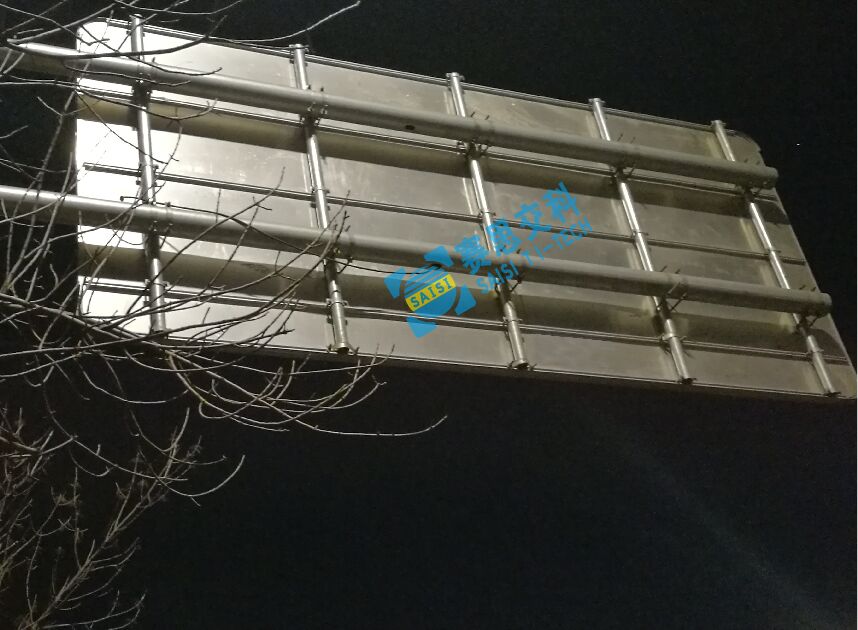 半透發光標志整體重量,較普通標志重,通常約25KG/平米,如果僅采用傳統標志的滑槽固定結構,標志的整體重量僅靠背板與抱邊連接處承擔重力,會導致標志后背板出現凸型拉伸面,長久下去,若遇上大風的橫向風壓,極易發送結構脫落的危險隱患。我們通常采用外接鍍鋅管轉移受力結構,將鍍鋅管的一段連接在標志的整體承重框架中,一段安裝抱箍、卡箍連接懸臂桿,保證的安裝結構的整體受力穩固,能抵御較大的自身重力和橫向風壓。