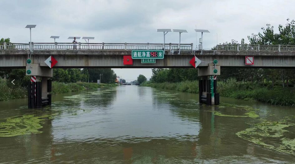 3、數(shù)據(jù)檢測:配置水位檢測雷達(dá)裝置,實施檢測水面凈空數(shù)值,疊加安全富裕高度數(shù)值,采用微控算法程序,實時向標(biāo)志版面?zhèn)鬟f凈空數(shù)值,動態(tài)顯示。如下圖: