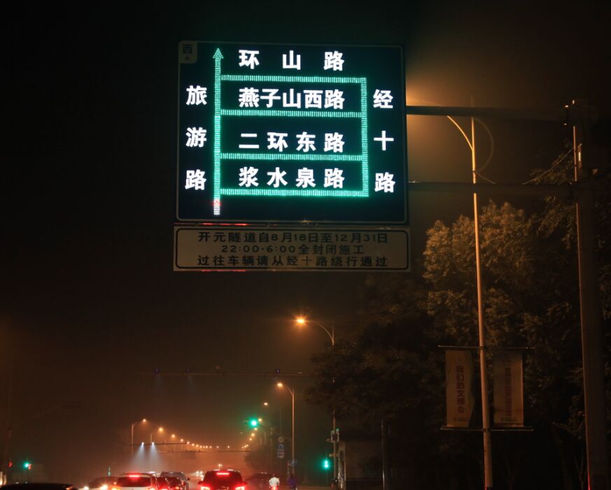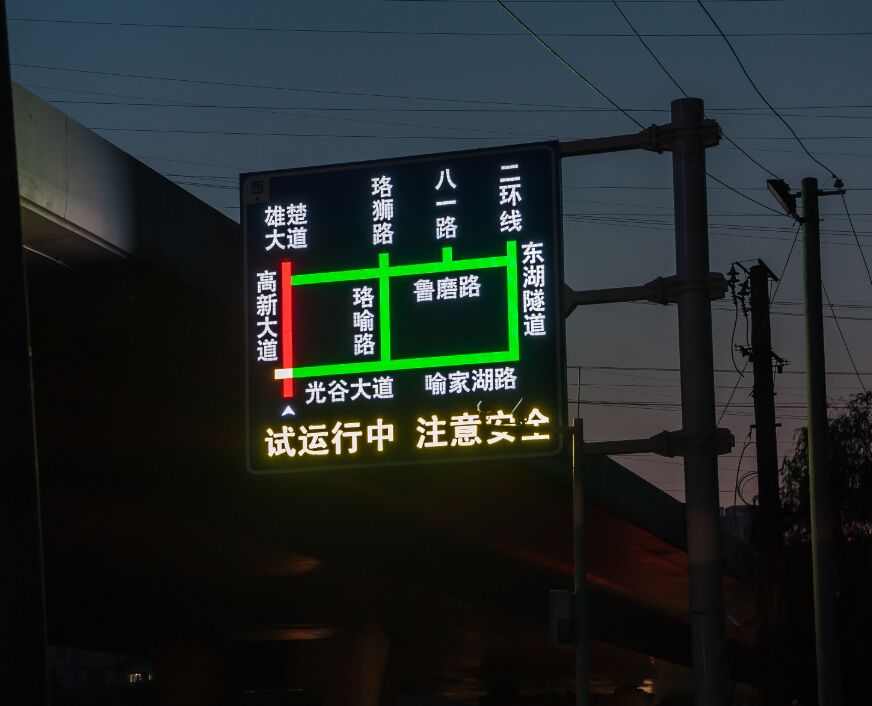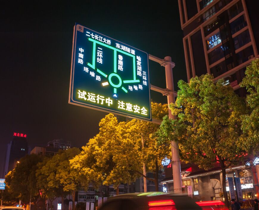 2、標(biāo)志版面整體采用主動發(fā)光技術(shù),路網(wǎng)部分嵌入三基色LED光帶誘導(dǎo)屏體。