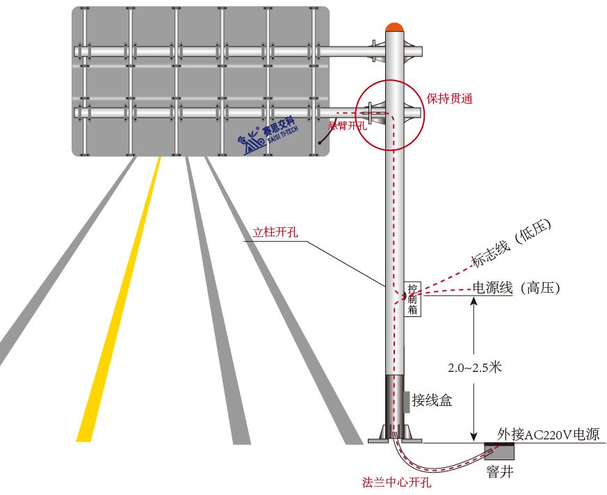 (3)安裝凈空安全。主動發光標志的安裝凈空應滿足《道路交通標志和標線》之道路交通標志(GB5768.2-2022)的技術要求,通常,懸臂類大型標志,其凈空不得小于5.0米,以防車輛刮蹭;路側小型標志,其凈空不得小于2.2米,以防行人碰頭。因特殊原因,需入侵建筑界限內的標志設施,應當配置必要的反光、發光警示設施,加強遠距離警示。