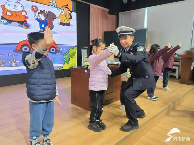 “生動活潑,入腦入心”。民警通過ppt為同學們介紹了各種常見的交通標志、標線,例如“一盔一帶”,“安全帶是生命帶”、“細觀察,不猛跑”等。同時,民警還開展了有獎互動,為答對問題的小朋友送上交通安全文創(chuàng)產(chǎn)品。