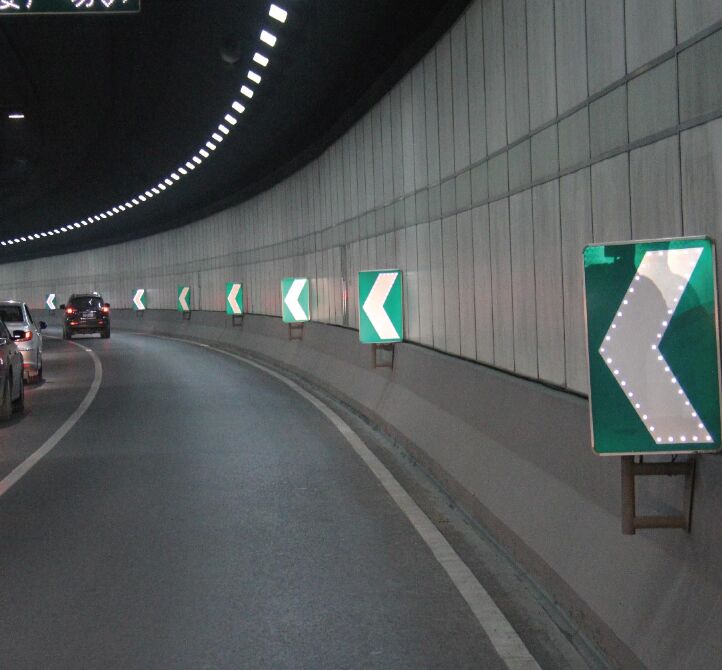 3、對于彎曲隧道路段應設置必要的視線誘導設施,如主動發光誘導設施等 。在隧道車道中心線以及兩側邊緣線上分別設置黃色與白色被動反光道釘,隧道兩壁附著主動發光輪廓標,提示駕駛人對向車道以及隧道墻壁的真實位置,消除緊張心理。