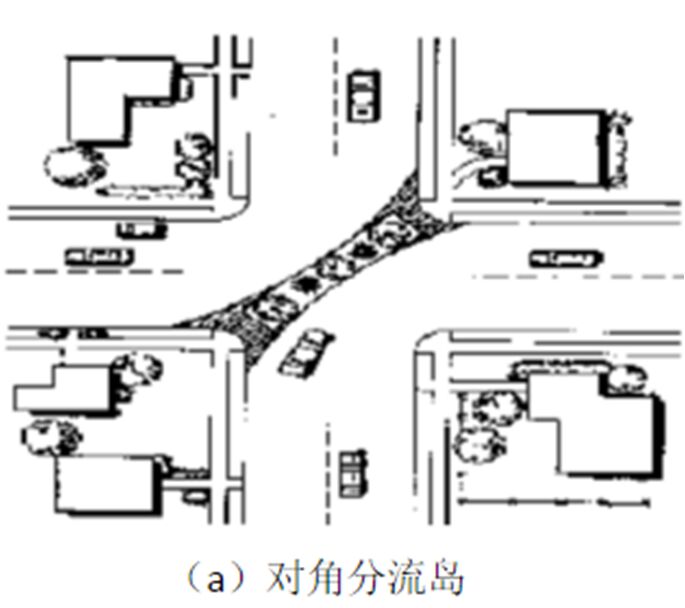 對角分流島是設置在交叉口對角線上的障礙物,以阻斷直行車流。其優點是:不需要封閉街道,只需要改變現有街道的方向;能保證行人和自行車通行。缺點是:需要重新改造拐彎處的路緣,造價可能比較高;內部和救援車有時需要繞行。