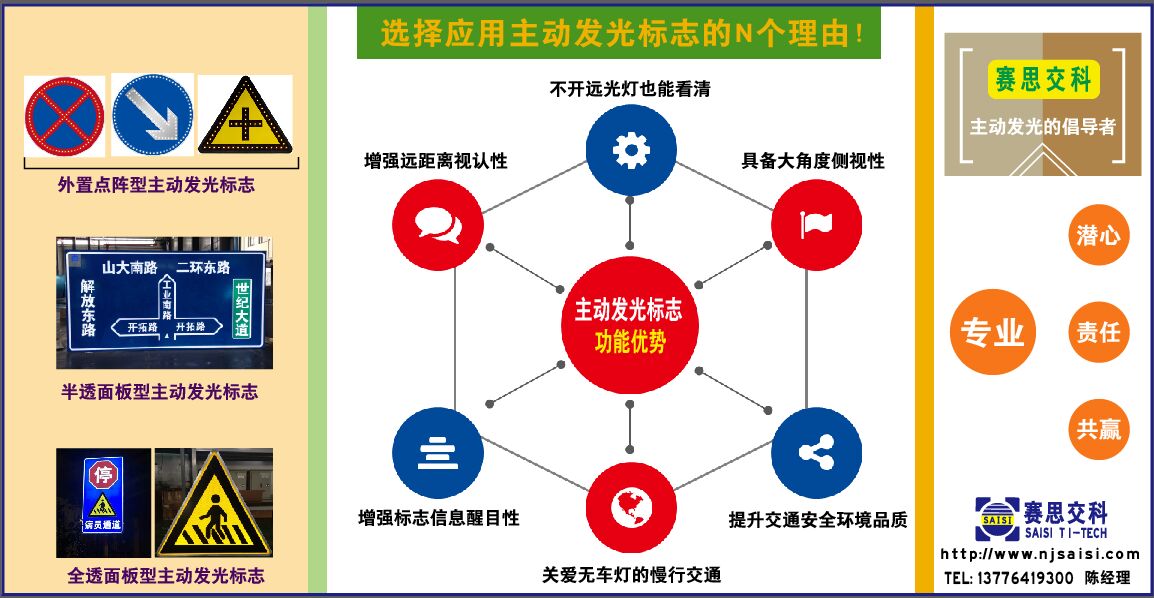 南京賽思交通信息科技有限公司,是一家專業從事交通安全研究、創新型交安設施研發的科技型公司,我公司研發、生產、銷售的主動發光標志系列產品,已在全國各地的交通安全工程中廣泛使用,并在交通穩靜化的提示、警示、管理方面取得了良好的功能效果,更多了解交通安全技術方案、創新交通安全產品,可登錄本網站m.195ww.com查閱,或致電:陳經理,13776419300。