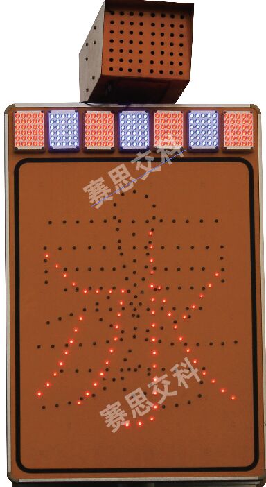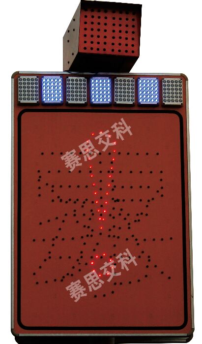 3、標志版面:標志整體為IV類黃色底模,不貼字膜,通過LED線型點陣勾勒出險情圖案或文字,標志上部設置各四只紅藍交替簡易型爆閃燈。